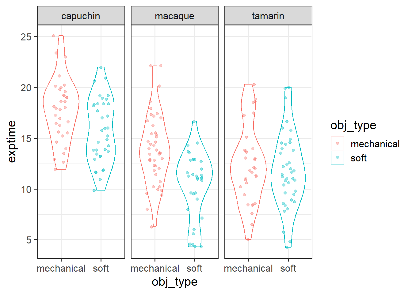 We’re wanting to plot exploration_time and obj_type here, but we’re also wanting to show it for each species. This means we’ll need things like colours, facets, etc.