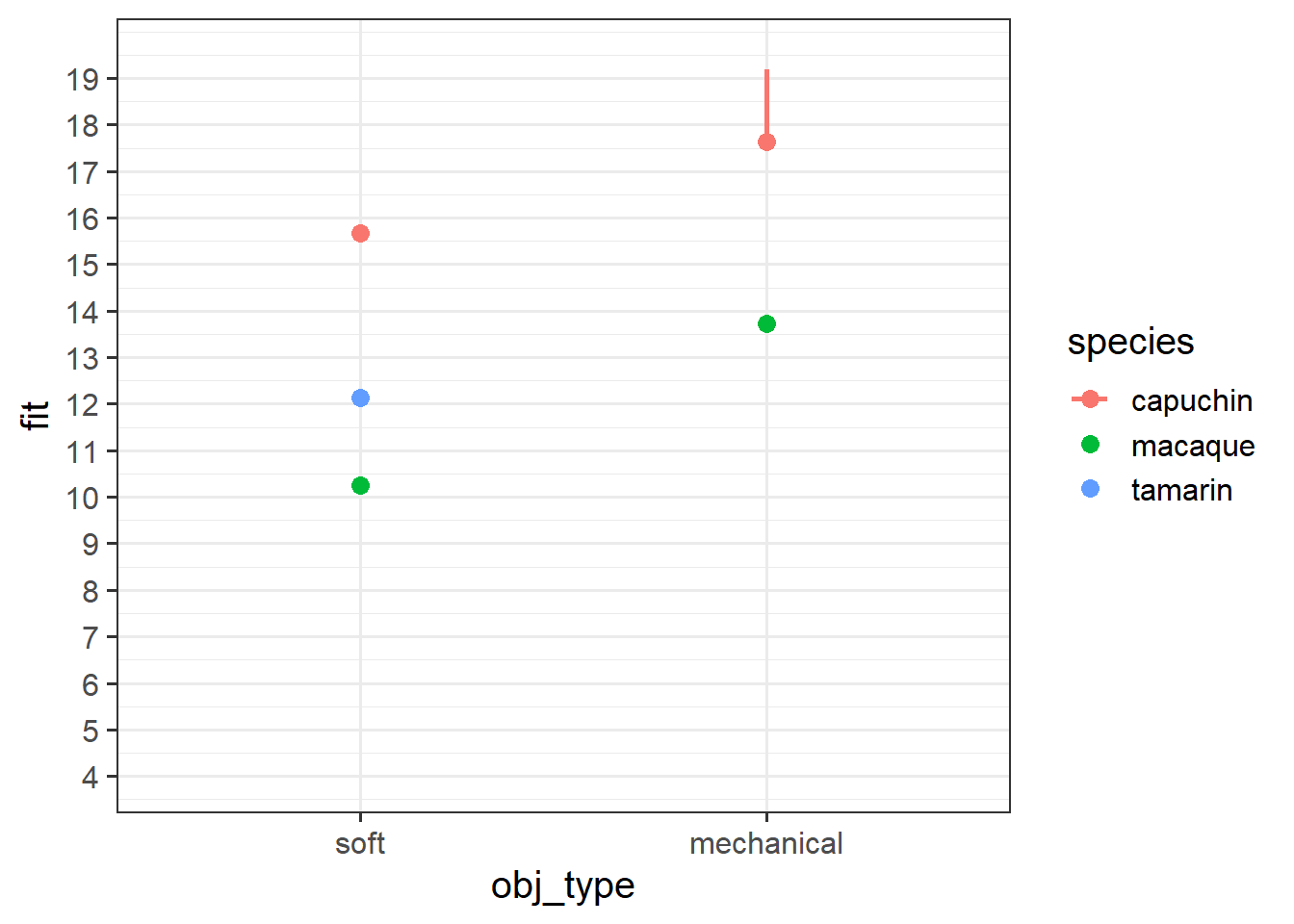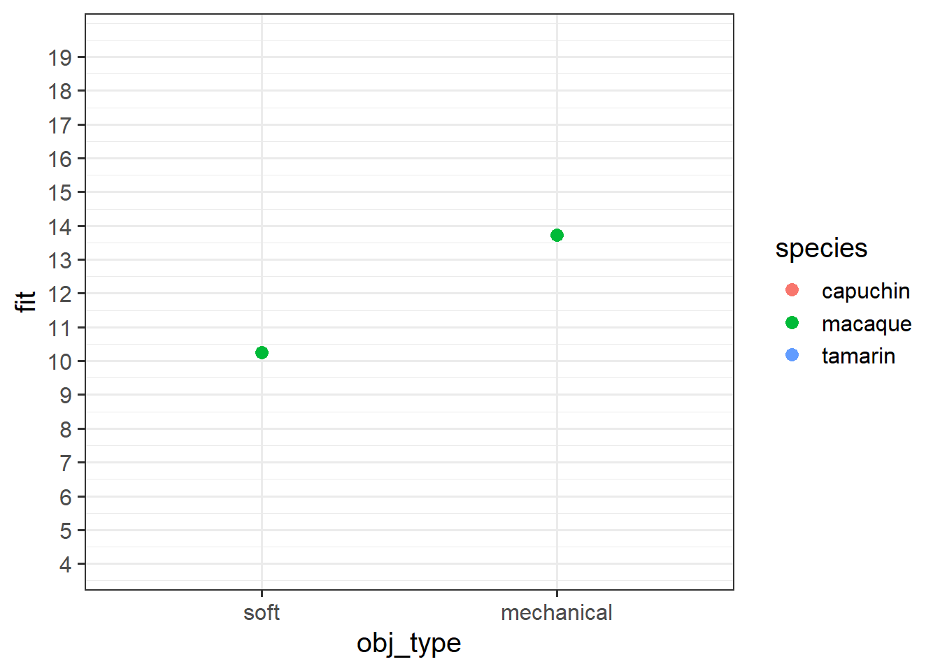 Below are our coefficients of interest from the model, when the reference level for obj_type is “soft” and for species is “macaque”.