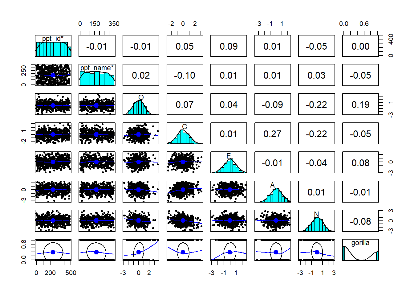 The data here come from a study of 483 participants who completed a Big 5 Personality Inventory (providing standardised scores on 5 personality traits of Openness, Conscientiousness, Extraversion, Agreeableness and Neuroticism), and then completed the selective attention task as seen above, from Simons & Chabris 1999.